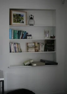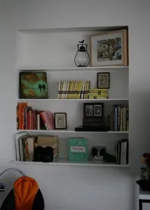 For the upgrade, I’m picturing a pale blue background (maybe the seaglass color ‘dewy’ from the nursery), carefully curated objects, some small hanging frames, pops of orange, a couple vases for flowers—and all the same books MUST still fit here. All the plays and scripts live downstairs, but classic novels, design books, how-to and baby tomes need to live on these shelves, without looking like a messy hodgepodge.